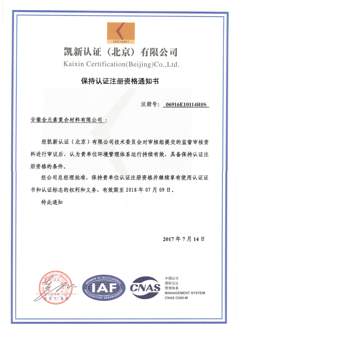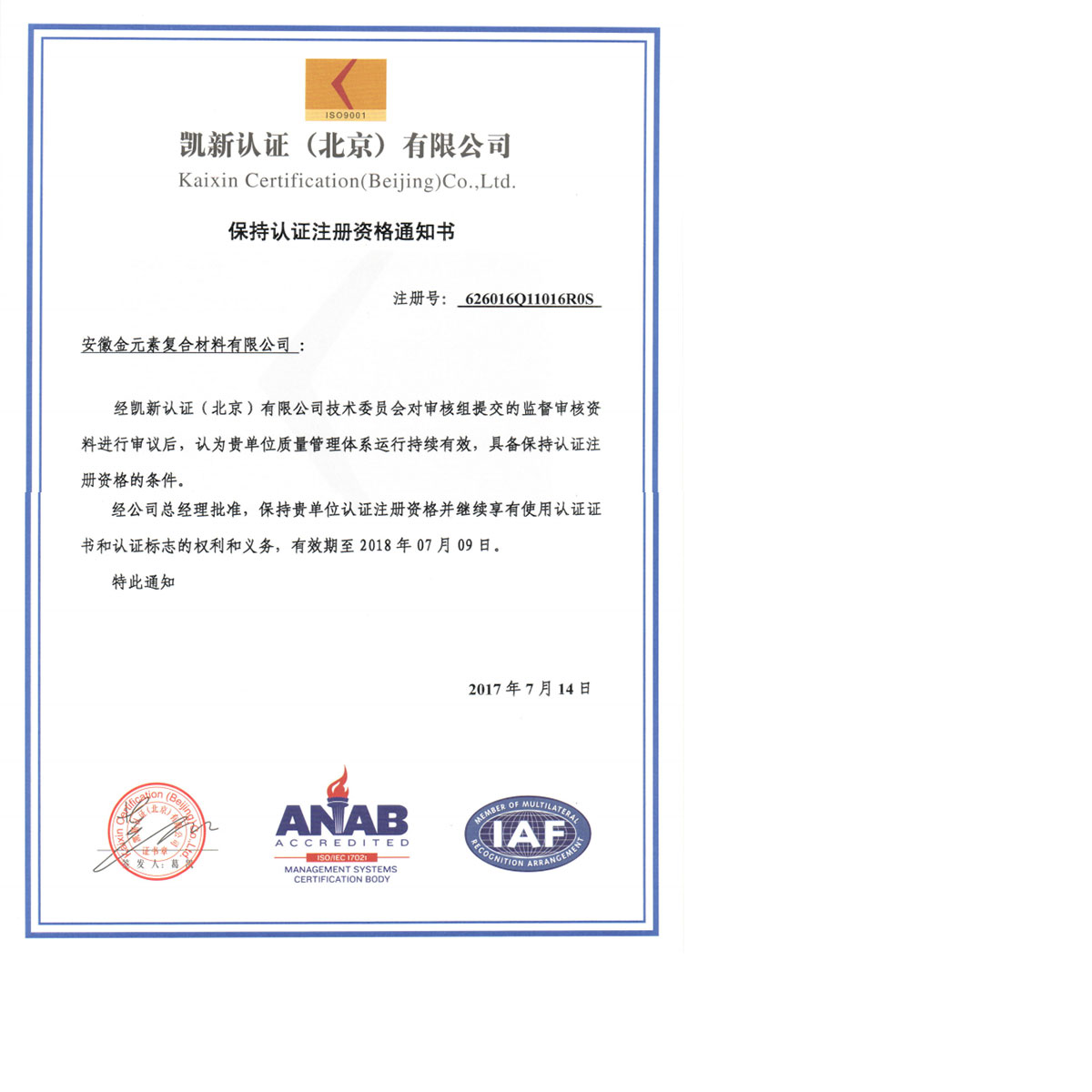 熱烈祝賀我公司獲得凱新認證批準保持證書